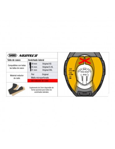 Recambio SHOEI Sin Reductor de Ruido Neotec 2. Acolchado lateral sin reductor de ruido para casco Shoei NEOTEC 2 .El grosor del acolchado se mide en milímetros. Para lograr un menor ajuste se utilizan medidas más delgadas, para lograr un mayor ajuste las medidas más gruesas. Todos los tamaños de acolchados son compatibles con todas las tallas.