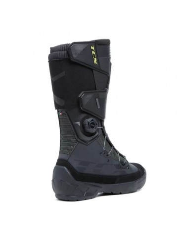 Botas TCX Infinity 3 GTX negro. Como novedad para la época dos mil veintidos, la bota TCX Infinity 3 está dirigida al corredor de carretera que desea un look un tanto "aventurero". Con su "escudo térmico" envolvente para resguardar la espinilla, el Infinity tres tiene un aspecto todoterreno, mas la verdad es que se trata de una bota de carretera. Ni tan siquiera es lo que llamaríamos una bota 'cruzada'. Una bota cruzada se puede utilizar tanto fuera de la carretera como dentro, mas esta no es una bota en la que te aventurarías fuera de la carretera a menos que, evidentemente, te encuentres en el lodo por accidente. El mercado objetivo para el TCX Infinity 3 es el ciclista de aventuras que prácticamente nunca deja las cosas negras; y seamos realistas, ¡eso es para la mayoría de los dueños de bicicletas de aventura! Esta es una bota con la que podría viajar o viajar. Sostendrá sus pies secos y va a estar correctamente protegido.