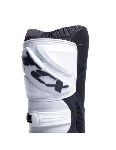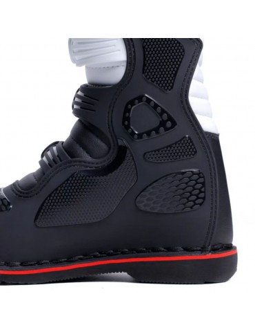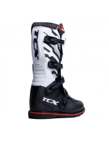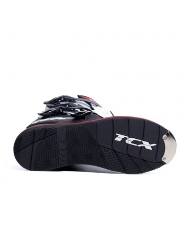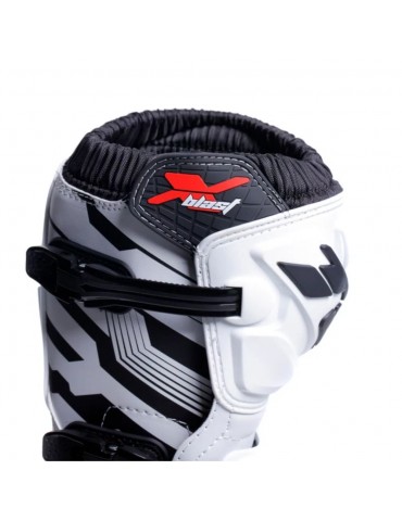 Botas TCX X-Blast negro / blanco / rojo. X-Blast es una bota todoterreno con empeine de microfibra y suela con construcción Goodyear, cómoda y protectora para usar en motos de motocross y enduro.La máxima seguridad está garantizada por los refuerzos de poliuretano en el maléolo, la puntera y la tibia. El sistema con cuatro palancas de aluminio intercambiables y ajustables hace que su cierre sea muy fácil y funcional.La suela está construida según la técnica «Goodyear», que aporta espesores y densidades diferenciadas y un inserto de acero para proteger la construcción, y que sirve para mantener unidas las capas que componen la suela a pesar de los impactos.La banda de rodadura garantiza una excelente tracción multilateral y agarre en todo tipo de terrenos.El forro de material transpirable Air Tech garantiza el máximo confort incluso durante la temporada de más calor, manteniendo la zona del pie seca y ventilada.