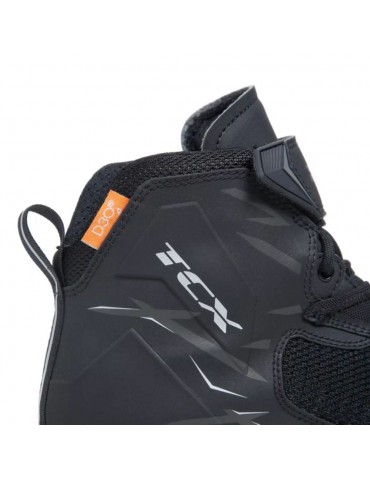 Zapatillas TCX R04D Air negro / gris. Las zapatillas TCX R04D Air han sido concebidas para satisfacer las necesidades de los usuarios en trayectos cortos tanto urbanos como fuera de ciudad con una clara orientación deportiva. El empeine está confeccionado en malla para ser lo más ventiladas posible además de inserciones D3O en el tobillo y refuerzos en la puntera y el talón.