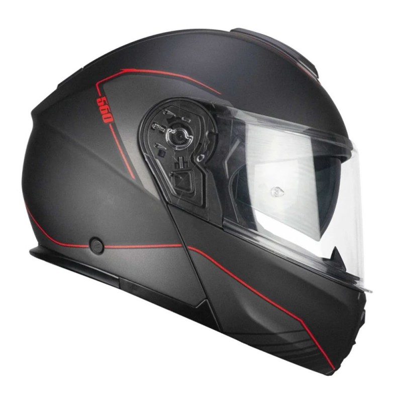 L'écran est conçu pour accueillir des lentilles Pinlock et le 100% MAX VISION PINLOCK 70 est inclus dans l'ensemble. Le 560 est équipé d'un système de ventilation AIR STREAM SYSTEM avec deux zones d'admission et une zone d'échappement. La double homologation P/J permet à l'utilisateur de rouler en toute sécurité avec le casque ouvert ou fermé.