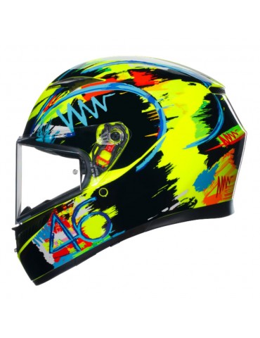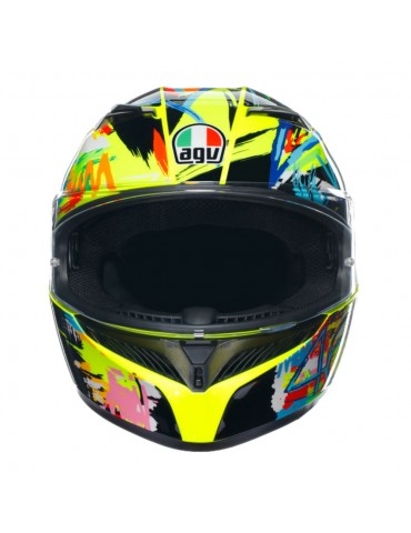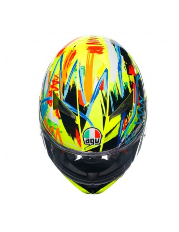 Casque AGV K3 E2206 MPLK Rossi Winter Test 2019. Le casque de piste ultime s'améliore encore, avec un système d'hydratation inclus, des prises d'air métalliques développées par la MotoGP et un spoiler bi-plate testé en soufflerie avec plusieurs ailes pour maximiser les performances aérodynamiques et ajouter de la stabilité à haute vitesse. La forme de la coque, composée à 100 % de fibres de carbone, a été conçue pour minimiser les interférences avec la combinaison de course, tandis que l'intérieur présente un ajustement moulé et des emplacements sans soudure dans les zones sensibles.