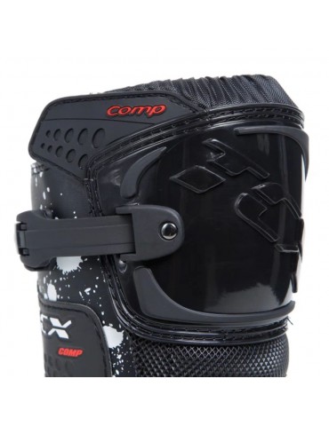 Bottes TCX Comp Kid noir / noir / blanc. Les bottes de motocross Comp Kid pour enfants sont un classique TCX pour les plus jeunes athlètes. La coupe et la construction reproduisent les modèles pour adultes, avec une tige en microfibre, une doublure AIR TECH respirante et une fermeture réglable avec des leviers en polyuréthane. La TCX Comp Kid est une botte de motocross certifiée CE, conçue pour offrir une protection mais aussi une sensibilité et un flex correct pendant la conduite, pour un excellent confort à tout moment.La protection maximale du pied et de la jambe est garantie par les renforts sur le tibia, la malléole et l'embout en polyuréthane. La semelle intérieure est de forme anatomique et amovible pour un confort maximal, et la semelle est en caoutchouc résistant à l'usure pour une adhérence optimale dans les étriers et sur le sol.