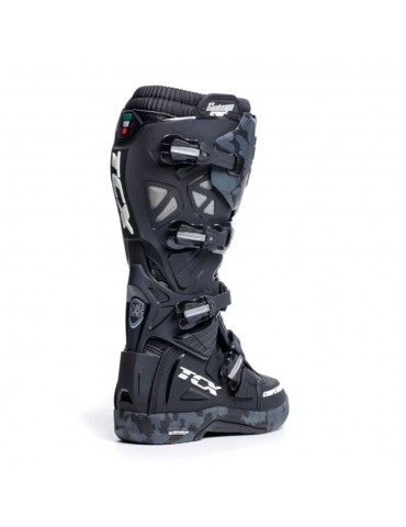 Bottes TCX Comp Evo 2 Michelin blanc / camo. Bottes de motocross et d'enduro conçues pour offrir une protection maximale, un maintien parfait de la cheville à chaque étape de la conduite et un confort optimal pour les sessions plus longues. Les Comp Evo 2 Michelin® se caractérisent par le système Double Flex Control : une articulation positionnée au niveau de la cheville, qui permet une grande flexibilité dans les mouvements d'avant et d'arrière de l'articulation, tout en évitant les risques de torsion et d'hyperextension indésirables. Les Comp Evo 2 Michelin® sont dotées de protections à tous les points stratégiques, tels que le tibia, la malléole, le talon et les orteils.Les Comp Evo 2 Michelin® sont équipées de la semelle Michelin® Hybrid MX, avec une bande de roulement et un composé spécialement conçus pour garantir une adhérence exceptionnelle sur les repose-pieds de la moto, même dans des conditions météorologiques défavorables, et sur tous les types de terrain, y compris les situations les plus extrêmes dans la pratique de l'enduro.Le système de fermeture comprend quatre boucles en polyuréthane et en aluminium avec réglage micrométrique. La tige intérieure est dotée de panneaux en velcro pour une personnalisation millimétrique de l'ajustement. Pour un meilleur ajustement, le Comp Evo 2 Michelin® est équipé du Calf Adjustment System, un système qui permet d'ajuster le protège-tibia avant dans deux positions différentes, augmentant ainsi la circonférence totale. La doublure en tissu respirant et les aérations latérales gardent le pied au sec pour un confort maximal.