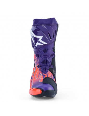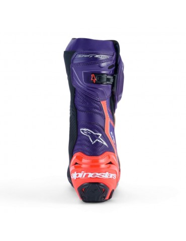 Bottes ALPINESTARS Supertech R LE Flyte violet / rouge / noir. La botte Supertech R Vented a fait l'objet d'un programme rigoureux d'améliorations afin d'optimiser ses caractéristiques de performance. Les innovations issues de l'expérience d'Alpinestars en matière de course haut de gamme comprennent une zone de flexion avant redessinée, un soufflet arrière redessiné, une guêtre supérieure redessinée, une nouvelle genouillère et une nouvelle plaque de tibia, une nouvelle glissière de tibia et une nouvelle doublure intérieure. Tous ces éléments améliorent le confort, la protection et les performances de cette botte à un niveau inégalé dans sa catégorie.