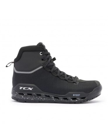 Bottines TCX Climatrek Surround GTX noir / blanc. Les chaussures TCX Climatrek Surround® sont conçues pour offrir la combinaison parfaite de protection lorsque vous êtes sur le vélo et de polyvalence lorsque vous n'êtes pas sur le vélo, dans toutes les situations, de la ville à l'extérieur. Climatrek Surround® est une chaussure certifiée avec des renforts au niveau de la cheville, des orteils et du talon, un support à lacets et des inserts réfléchissants. Les chaussures de moto certifiées TCX Climatrek Surround® sont conçues pour offrir une imperméabilité et une respirabilité maximales en combinant la membrane Gore-Tex Extended Comfort® et la technologie Gore-Tex Surround®. Le tissu technique associé à la membrane Gore-Tex Extended Comfort® imperméable et hautement respirante est combiné à la construction spéciale Gore-Tex Surround® conçue pour canaliser la chaleur et l'humidité vers l'extérieur également à travers la semelle extérieure, équipée d'une grille de ventilation pour permettre une isolation parfaite des agents atmosphériques et en même temps favoriser un échange thermique continu entre l'intérieur et l'extérieur, idéal pour les climats plus chauds et l'utilisation en trois saisons. La semelle Groundtrax® présente un profil et un composé spéciaux conçus pour garantir la stabilité et l'adhérence aux repose-pieds et aux commandes, ainsi qu'une traction maximale et un grand confort lors de la marche sur tous les terrains.