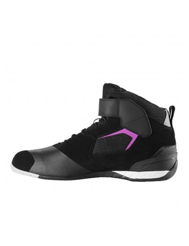 Bottines SPIDI X-Radical Lady noir / fuchsia. De moto certifiées au look sportif, parfaites pour l'été. La microfibre en maille perforée assure la fraîcheur, tandis que la semelle anatomique et le renforcement du talon, de la pointe et de la cheville rendent cette chaussure idéale pour la conduite sur route en été. La fermeture à lacets en velcro et les renforts de talon en polyuréthane absorbant les chocs complètent les performances de ces chaussures de moto.