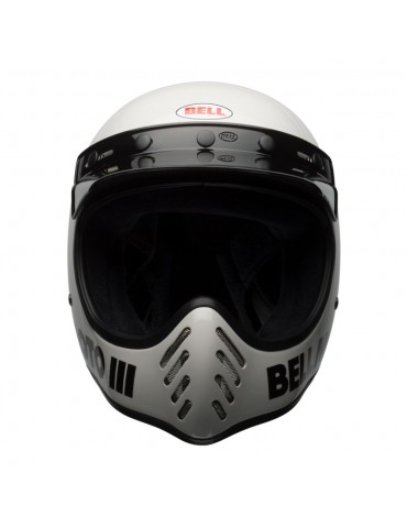 Casque BELL Moto-3 Classic blanc brillant. Le Moto-3 d'aujourd'hui conserve l'élégance d'antan, tout en bénéficiant des améliorations modernes en matière de sécurité et de production. De la coque en fibre de verre à la mentonnière doublée d'EPS, tout a été soigné dans les moindres détails. Les couleurs unies reprennent le style de la doublure en peluche originale, tandis que les graphismes des artistes collaborateurs présentent une doublure en peluche microante.