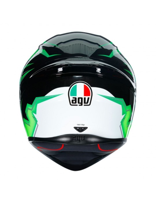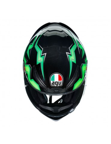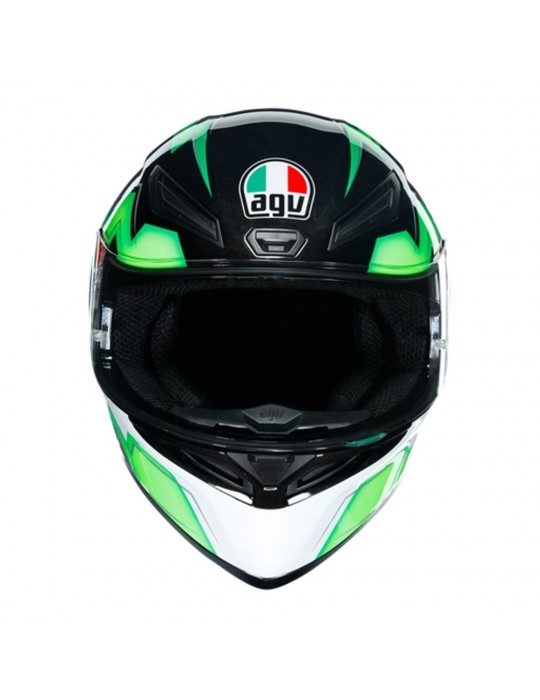 Casque AGV K1 S E2206 Kripton noir / vert. La forme aérodynamique, les évents avant développés pour la course et le spoiler testé en soufflerie maximisent les possibilités et assurent la stabilité à grande vitesse. Le capuchon panoramique anti-rayures offre un champ de vision plus large, tant latéralement que verticalement, pour un contrôle total de l'environnement. Avec des intérieurs Dry-Comfort doux et amovibles, le confort est assuré.