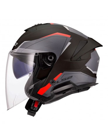 Casque LS2 OF618 Verso II AIR noir / rouge. jet fabriqué en alliage polymère (KPA) qui offre des niveaux de protection élevés. Il dispose d'un grand écran transparent, d'un pare-soleil intégré et d'un système de ventilation efficace. Une très bonne option pour un casque pour une utilisation quotidienne en ville.