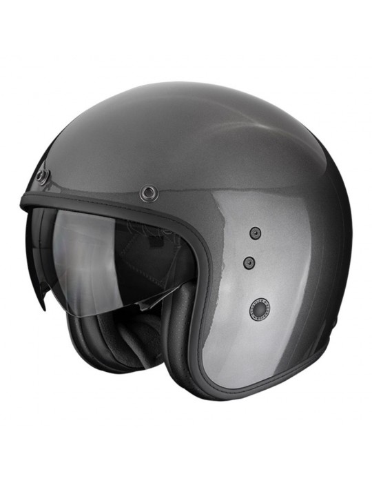 Casque SCORPION Belfast Evo Solid gris métallique. Casque jet qui combine un look moderne et rétro, idéal pour la conduite urbaine. La coque extérieure est fabriquée en Ultra TCT® avec de la fibre de verre pour une grande protection. Il est doté d'un pare-soleil Speedview™ et d'un rembourrage intérieur Kwikwick 2™ très confortable, facilement amovible et lavable.