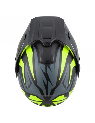 - La ventilation supérieure favorise le renouvellement de l'air à l'intérieur du casque et la ventilation dans la partie supérieure de la mentonnière empêche la formation de buée sur l'écran. Dans la mentonnière, on trouve également une ventilation réglable indiquée pour les parcours les plus exigeants. Cette grande aération de la mentonnière est particulièrement adaptée à une utilisation hors route, elle dispose donc d'un filtre à poussière amovible et lavable.