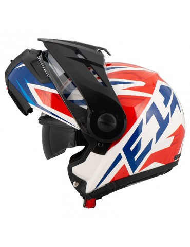 - L'une des caractéristiques les plus remarquables du E1 est l'intégration d'un pare-soleil qui peut être réglé à 3 hauteurs différentes, indépendamment de l'écran et du système d'ouverture du menton. À cet égard, le Schuberth E1 permet 3 réglages :