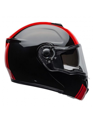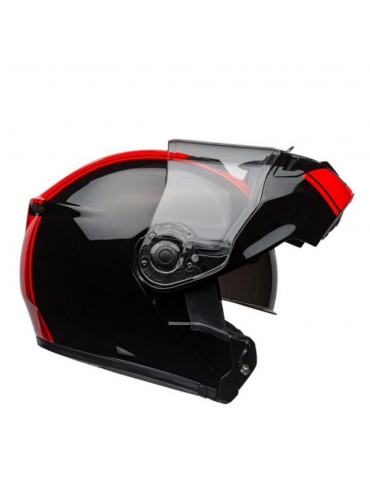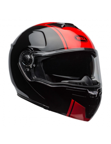 Casque BELL SRT Modular Ribbon noir / rouge. Le SRT-Modular combine l'architecture de qualité du casque SRT - coque en fibre de verre, doublure EPS avec compartiments pour haut-parleurs, large éventail de tailles et visière Panovision™ Classe 1 - avec la polyvalence et le confort d'un casque modulaire.