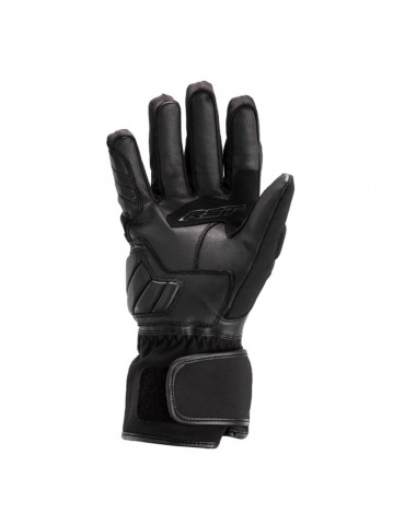 Gants RST Axiom WP noir. Marqués CE de niveau 1, ils sont conçus pour résister au temps pluvieux. Fabriqués en cuir pleine fleur, avec membrane SinAqua imperméable et détails réfléchissants. Doigts pré-courbés et panneaux tactiles élastiques pour l'index et le pouce. Paume en cuir double couche, renforcée par un rembourrage et des grips en silicone pour une meilleure adhérence.