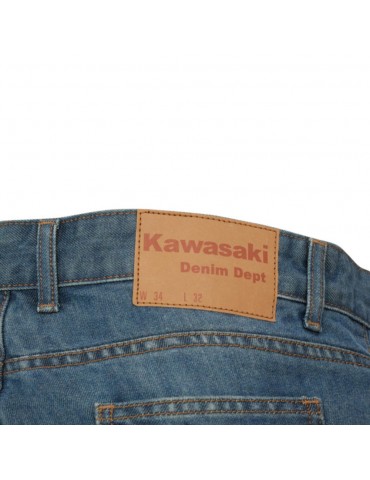 Pantalon KAWASAKI Nice Kevlar Denim. Ce jean western à cinq poches présente des caractéristiques traditionnelles telles qu'une poche à monnaie, une braguette à l'avant, des coutures contrastées et un motif à moustaches sur le devant de la jambe, au-dessus des cuisses. De plus, la jambe fuselée offre une coupe ajustée.