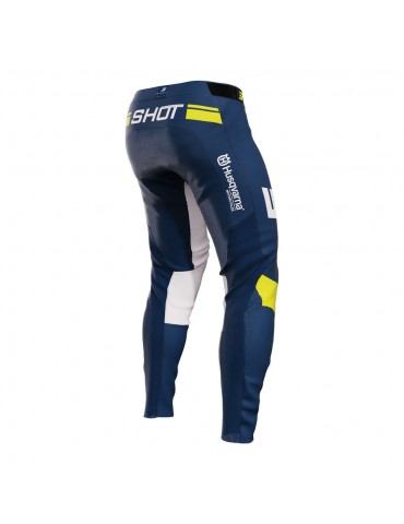 Pantalon SHOT Husqvarna Limited Edition 2024 bleu. Vivez une nouvelle expérience de pilotage sous le signe de la performance avec le pantalon de motocross adulte Aerolite ultra-léger et confortable de Shot.