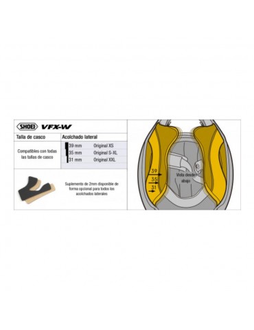 Remplacement SHOEI VFX-W. Rembourrage latéral pour le casque Shoei VFX-W. L'épaisseur du rembourrage est mesurée en millimètres. Les tailles plus fines sont utilisées pour un ajustement plus petit, les tailles plus épaisses pour un ajustement plus grand. Toutes les tailles de rembourrage sont compatibles avec toutes les tailles.