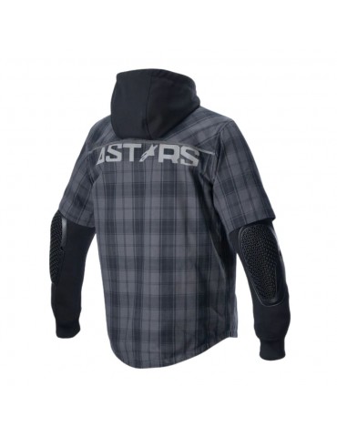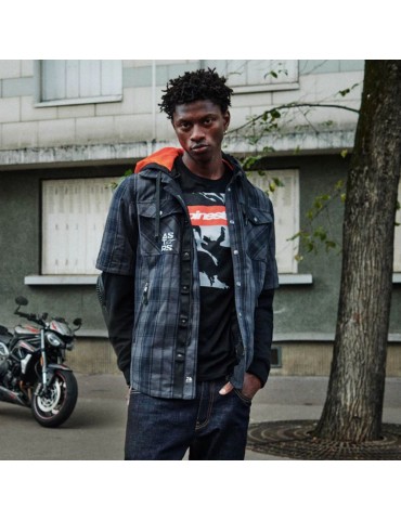 Shirt ALPINESTARS MO.ST.EQ Tartan gris tar / noir. Le MO.ST.EQ (Moto Streetwear Equipment) Tartan Shirt est un vêtement d'équitation mi-chemise, mi-capuche qui crée une approche totalement unique des vêtements de moto et du style individuel du pilote, tout en offrant une protection complète. Conçu comme une chemise à manches courtes avec une capuche intérieure fixe, le tartan est fabriqué avec 9 % d'élasthanne interne, un matériau extensible dans les 4 sens avec une armure attachée et exposée, et un matériau extérieur à carreaux en polyamide haute résistance.