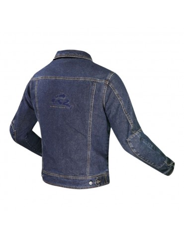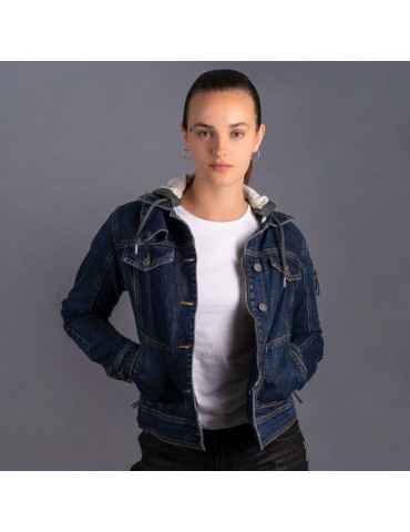 Veste LS2 OAKY Lady bleu foncé. Veste en denim de style urbain avec capuche amovible en coton. Fermeture à double zip et bouton pour une ventilation et un ajustement parfaits. Protections amovibles aux coudes et aux épaules.