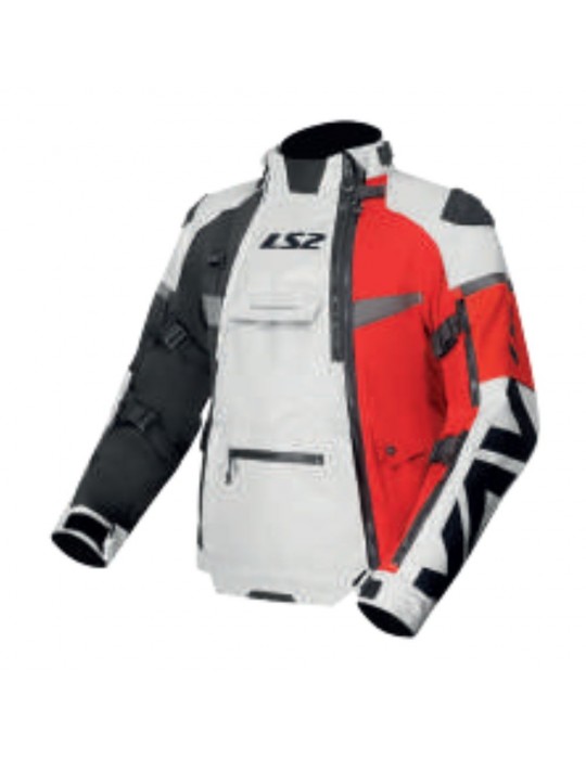 Veste LS2 X-Master noir / gris / rouge. Veste imperméable 3 couches de style aventure, conçue pour toutes les saisons, avec de multiples aérations pour toutes les conditions météorologiques. Comprend une doublure thermique amovible et une couche imperméable détachable qui peut être portée par-dessus ou par-dessous la veste.