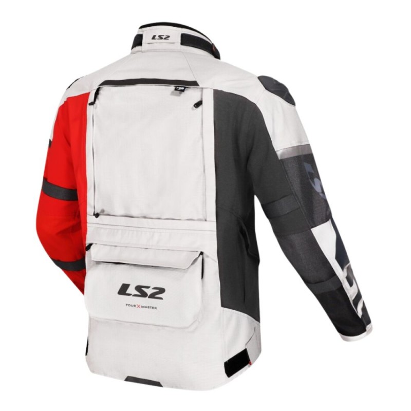 Veste LS2 X-Master noir / gris / rouge. Veste imperméable 3 couches de style aventure, conçue pour toutes les saisons, avec de multiples aérations pour toutes les conditions météorologiques. Comprend une doublure thermique amovible et une couche imperméable détachable qui peut être portée par-dessus ou par-dessous la veste.