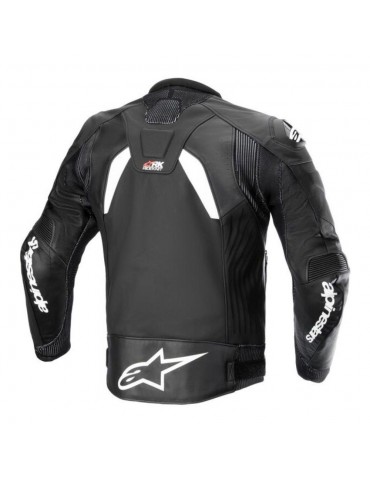 Veste ALPINESTARS GP Plus R V4 Rideknit Leather noir / blanc. Elle est optimisée pour une plus grande liberté de mouvement et un plus grand confort du pilote, et présente de nombreuses caractéristiques et matériaux dérivés de la course, notamment une coupe "Sport" unique avec des bras pré-courbés pour des performances de pilotage maximales et une protection éprouvée en course au niveau des épaules et des coudes.