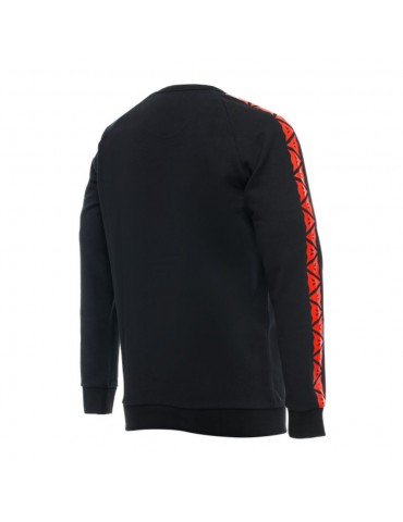 Pull DAINESE Stripes noir / rouge fluor. Il s'agit d'un pull décontracté à col ras du cou en pur coton, confortable et pratique pour un usage quotidien et pour les loisirs.