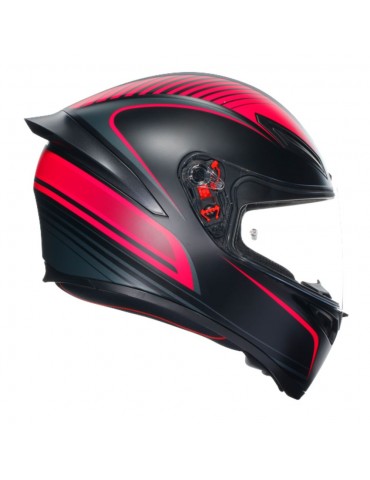 Casco AGV K1 S E2206 Warmup negro / rosa. La manera aerodinámica, las rejas de ventilación frontales desarrolladas para la competición y el alerón probado en túnel de viento maximizan las posibilidades y dan estabilidad a grandes velocidades. La gorra panorámica antirayaduras ofrece un campo de visión más extenso, tanto lateral como vertical, para un control total del ambiente. Con los suaves y desmontables interiores Dry-Comfort, la comodidad está asegurada.