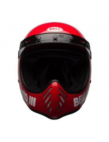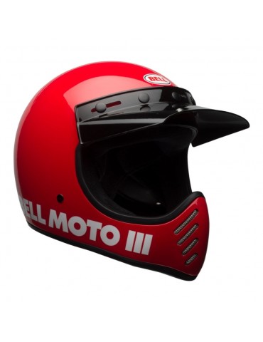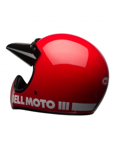 Casco BELL Moto-3 Classic rojo brillo. El Moto-3 actual sigue manteniendo la elegancia de antaño, con el beneficio añadido de la seguridad moderna y las mejoras en la producción. Desde la calota de fibra de vidrio hasta la cinta forrada en EPS de la barbilla, todo se ha cuidado hasta el último detalle. Los colores sólidos usan el mismo estilo del forro de felpa original, mientras que las gráficos de artistas colaboradores presentan un forro afelpado de microante.