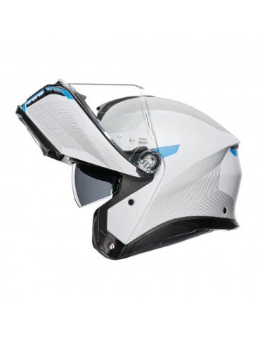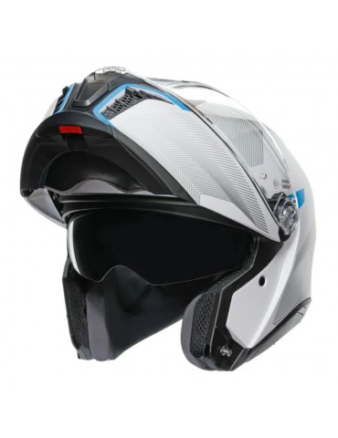 Casco AGV Tourmodular Multi MPLK frecuencia gris claro / azul. El nuevo Tourmodular está homologado conforme la nueva normativa ECE 22.06 y la doble homologación P/J. Se trata de un casco modular segurísimo, agradable y con sistema de comunicación DMC Mesh integrado, el más alto estándar de comunicación inalámbrica entre motoristas. El Tourmodular ha sido desarrollado para encarar largos viajes con la máxima comodidad y seguridad. Calota exterior fabricada en fibra de carbono, fibra aramídica y fibra de vidrio. Su suave interior confeccionado en tejido Ritmo y Shalimar con sistema de personalización del ajuste, garantiza la absorción inmediata de la humedad y el sudor. Cuenta, además de esto, con visor solar integrado, como con un eficiente sistema de ventilación integrado.