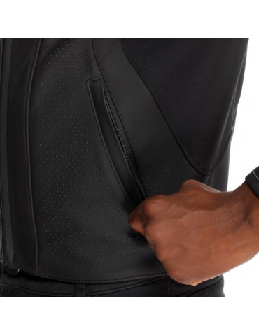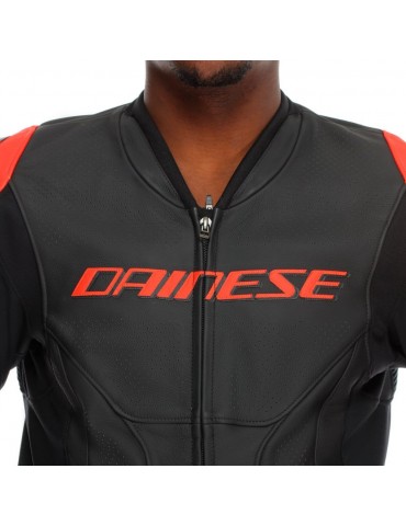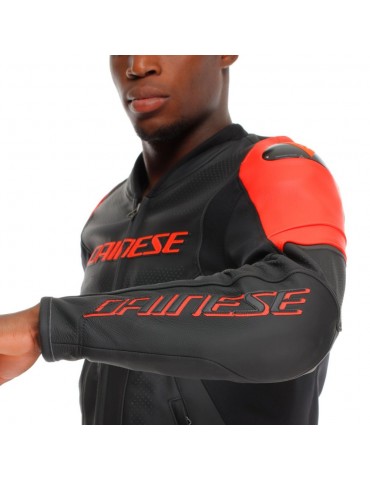 Chaqueta DAINESE Racing 5 PERF negro / negro / rojo fluor. La Racing 5 Perf es la chaqueta de moto con un corte regular y deportivo confeccionada de fina piel vacuna Tutu de 1,2 mm con perforaciones estratégicamente colocadas, para una máxima ventilación en los días más calurosos. El enfoque en la ergonomía llevó a estudios sobre las posiciones de conducción, con el fin de perfeccionar detalles diseñados para reducir la presión sobre el cuello, como el collar Veloce Racing Neck, y garantizar la máxima comodidad y movilidad integrando un ancho S1 tejido bielástico así como sistemas de ajuste en las caderas. El confort de conducción se combina con niveles superiores de protección con certificación EN 17092 clase AA, el Racing 5 Perf. La chaqueta cuenta con protectores compuestos certificados según CE Nivel 2 estándar en codos y hombros, así como inserciones de aluminio reemplazables en los hombros que garantizan una apariencia más natural movimiento deslizante en caso de caída y un bolsillo diseñado para acomodar protectores de espalda y pecho tipo G. Como resultado de estudios sobre el ajuste correcto, la chaqueta se puede llevar cómodamente sobre el dispositivo airbag Dainese Smart Air sin la necesidad de comprar un tamaño más grande. El ajuste adecuado de las mangas evita que los protectores se desplacen al área equivocada durante una caída, garantizando así siempre la máxima protección para los ciclistas. Además, las presillas que sujetan el Smart Air a la chaqueta permiten a los ciclistas ponérselo y quitárselo con un solo movimiento, para que el airbag mantenga siempre la posición correcta debajo de la chaqueta. El nivel de esta prenda y la funcionalidad en cualquier condición climática se ve reforzada por un práctico bolsillo interno impermeable donde los ciclistas pueden guardar sus dispositivos electrónicos en caso de mal tiempo.