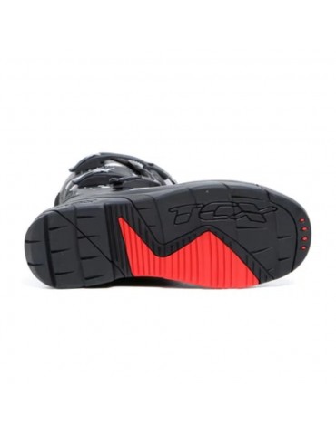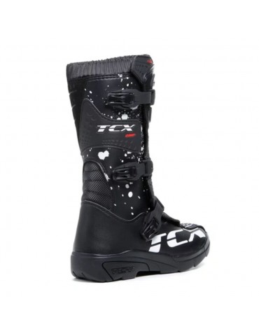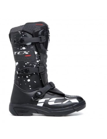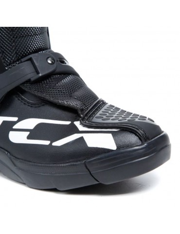 Botas TCX Comp Kid negro / negro / blanco. Las botas de motocross para niño Comp Kid son un clásico de TCX para los deportistas más jóvenes. El equipamiento y la estructura replican los modelos para adultos, con parte superior de microfibra, forro transpirable de AIR TECH y cierre ajustable con palancas de poliuretano. Las TCX Comp Kid son unas botas de motocross con certificación CE, diseñadas para ofrecer protección pero al mismo tiempo sensibilidad y la correcta flexión durante la conducción, para disfrutar de una excelente comodidad en todo momento.La máxima protección del pie y la pierna está garantizada por los refuerzos en la tibia, el maléolo y la puntera de poliuretano. La plantilla es anatómica y extraíble, para proporcionar la máxima comodidad, y la banda de rodadura está hecha de goma resistente al desgaste, para disfrutar de un agarre óptimo en los estribos y en el terreno.