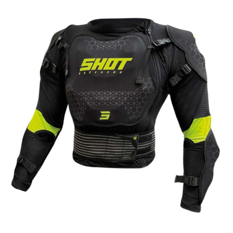 Peto SHOT Optimal Kid 2.0 negro / amarillo neón. Peto integral de niño conformado por protecciones ded termoplastico inyectado en la espalda, pecho, codos y hombros.