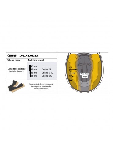Recambio SHOEI J-Cruise. Acolchado lateral para casco Shoei J-cruise .El grosor del acolchado se mide en milímetros. Para lograr un menor ajuste se utilizan medidas más delgadas, para lograr un mayor ajuste las medidas más gruesas. Todos los tamaños de acolchados son compatibles con todas las tallas.
