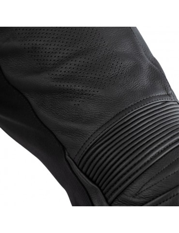 Pantalón RST Sabre negro. De corte deportivo y con una gama de prestaciones para maximizar su protección, comodidad y ajuste. Hechos de cuero de vaca de primerísima calidad, de tacto suave y acabado mate. Reforzados con tejido elástico en cuatro direcciones y paneles elásticos a lo largo de toda la prenda, para darte la máxima libertad de movimientos al llevarlos.