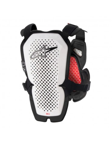 Protector de tórax ALPINESTARS A-1 Pro branco / preto / vermelho. Possui um protector de tórax com certificação CE e UKCA Nível 1 de tecnologia híbrida de poliedro e um protector de costas de tecnologia de poliedro que oferece níveis imbatíveis de ventilação, é super leve e oferece uma excelente protecção da parte superior do corpo contra impactos.