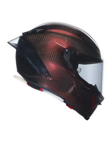 Capacete AGV Pista GP RR E2206 DOT MPLK Mono carbono vermelho. O Pista GP RR é uma réplica fiel do capacete AGV utilizado em corridas pelos pilotos profissionais de torneios do planeta. Por esta razão, recebeu a homologação FIM, que certifica o mais alto nível de protecção possível, mesmo contra qualquer torção perigosa da cabeça. Cada detalhe é desenvolvido para garantir o máximo desempenho. O invólucro de carbono extremo em fibra de carbono 100% garante uma leveza excepcional, tornando-o fácil de usar. As suas formas e os furos de ventilação metálicos foram estudados no túnel de vento e testados por atletas AGV para assegurar a melhor penetração aerodinâmica e a melhor estabilidade a alta velocidade, também como resultado do perfil renovado do spoiler traseiro PRO. Com uma espessura de até cinco mm, a tampa óptica Ultravision Classe 1 é parte integrante da protecção que proporciona uma visão panorâmica de 190°. Isto significa que o cavaleiro vê a pista, adversários e obstáculos mais claramente do que qualquer outra pessoa.