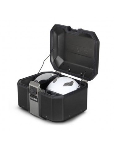 Top case SHAD TR55 Terra Edição em preto. A mala TR55 foi concebida e fabricada 100% em Barcelona e tem capacidade para um capacete de trail ou dois capacetes (full face + jet). Tem um design estrutural aerodinâmico e integrado feito de liga de alumínio endurecível, um tipo de alumínio que permite uma espessura reduzida de 1,2 mm para máxima resistência com peso mínimo. A TERRA BLACK EDITION oferece um acabamento em pintura preta resistente a riscos. Dobradiças em aço inoxidável AISI 304.