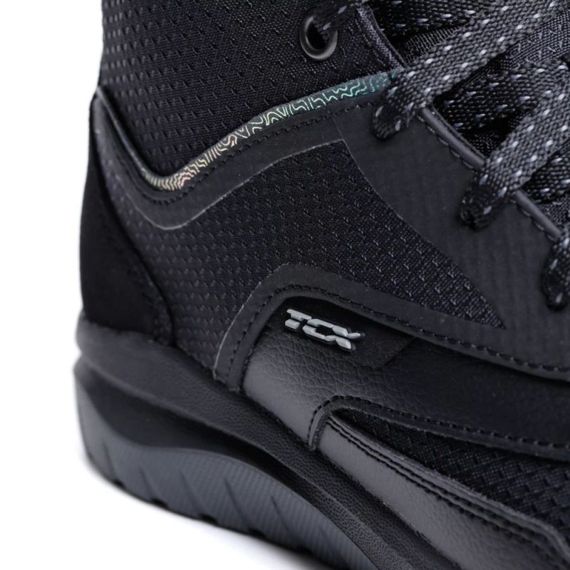 Botins TCX Nalbak WP Lady preto / iridescent. A NALBAK WP WMN é a bota de motociclismo para mulher para uso urbano, em todas as condições climatéricas e concebida para oferecer conforto e proteção tanto na bicicleta como ao andar. A presença da membrana T-DRY (PFAS-FREE) garante a impermeabilidade sem comprometer a respirabilidade, mantendo os pés secos mesmo nos dias mais chuvosos, para uma utilização quotidiana em 3 estações. A proteção D3O® no maléolo, combinada com o disco rígido fino, confere ao sapato um elevado nível de conforto e liberdade de movimentos.