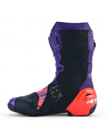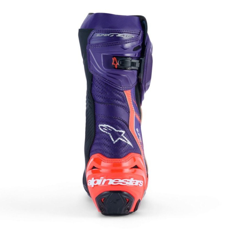 Botas ALPINESTARS Supertech R LE Flyte púrpura / vermelho / preto. As botas Supertech R Vented foram submetidas a um rigoroso programa de melhorias para otimizar ainda mais as suas características de desempenho. Com amplas perfurações em toda a bota para maximizar o fluxo de ar, as inovações derivadas da experiência da Alpinestars em competições de alto nível incluem uma zona de flexão dianteira redesenhada, um fole traseiro redesenhado, uma polaina superior redesenhada, uma nova alavanca de mudanças e placa de canela, um novo deslizador de canela e um novo botim interior. Tudo isto melhora o conforto, a proteção e o desempenho desta bota para um novo nível, líder na sua classe.