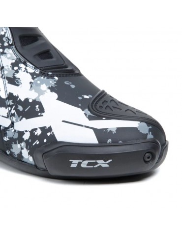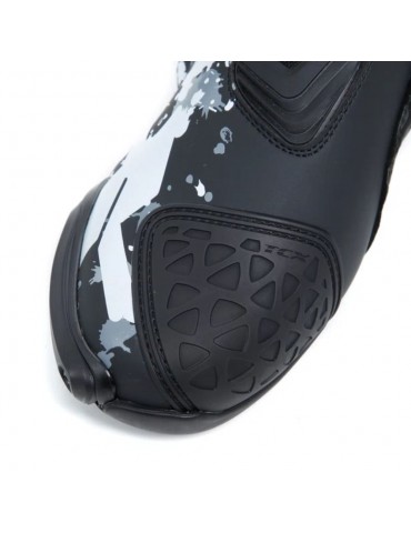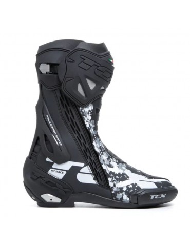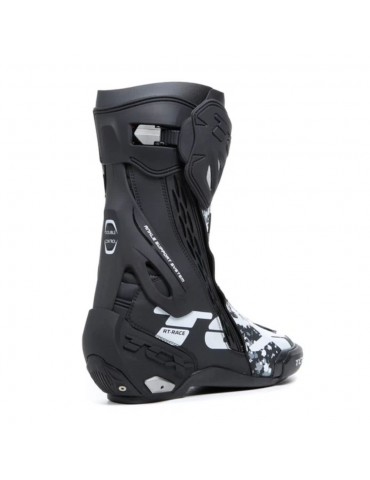 Botas TCX RT-Race preto / branco / cinza. A RT-Race oferece as mesmas características técnicas que as botas RT-Race Pro Air topo de gama, mas sem a sola Michelin, painéis micro-perfurados e barras deslizantes traseiras e do pé de magnésio, este modelo é feito de poliuretano. A RT-Race apresenta os últimos avanços na tecnologia TCX para oferecer ao ciclista o melhor dos melhores em protecção, ajuste e sensibilidade na moto. Feitas de Microfibra de alta tecnologia, as botas TCX RT-Race apresentam o sistema D.F.C. que reduz o risco de hiperextensão articular e entorse de tornozelo. Incorporam o sistema interno de fecho Fasten Fit Control (FFC) para maior precisão na bicicleta.