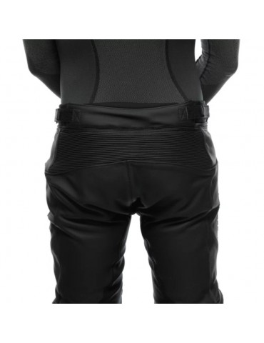 Calças DAINESE Delta 4 PERF. preto / preto. As Delta 4 Perf. são calças de motociclista em pele de vaca tutu com perfurações localizadas combinadas com inserções em tecido elástico S1, tal como o blusão Racing 4 Perf., que complementam na perfeição e ao qual podem ser fixadas graças ao prático fecho de ligação.