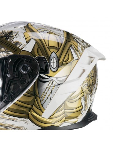 Capacete CGM 363S Shot Nippo ouro / branco. O 363 SHOT é a resposta da CGM ao motociclista que procura um capacete orientado para a competição. A calota exterior e o inovador spoiler traseiro foram concebidos para maximizar a eficiência aerodinâmica a alta velocidade. Fabricado em dois tamanhos de calota exterior, possui um sistema de regulação térmica no interior do capacete, constituído por três zonas de condutas que asseguram um fluxo de ar contínuo. A viseira exterior, preparada para Pinlock 70, é basculante para uma perfeita aderência aos vedantes de duplo perímetro e, juntamente com o fecho na posição fechada, garante silêncio e conforto na condução. O 363 está igualmente equipado com uma pala de sol interna retráctil. O compartimento interior é composto por uma tampa hexagonal termoformada, tecidos ExtraCool, faixas de alta visibilidade.