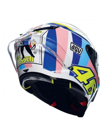 Capacete AGV Pista GP RR E2206 DOT MPLK Assen 2007. O Pista GP RR é uma réplica fiel do capacete AGV utilizado em corridas pelos pilotos profissionais de torneios do planeta. Por esta razão, recebeu a homologação FIM, que certifica o mais alto nível de protecção possível, mesmo contra qualquer torção perigosa da cabeça. Cada detalhe é desenvolvido para garantir o máximo desempenho. O invólucro de carbono extremo em fibra de carbono 100% garante uma leveza excepcional, tornando-o fácil de usar. As suas formas e os furos de ventilação metálicos foram estudados no túnel de vento e testados por atletas AGV para assegurar a melhor penetração aerodinâmica e a melhor estabilidade a alta velocidade, também como resultado do perfil renovado do spoiler traseiro PRO. Com uma espessura de até cinco mm, a tampa óptica Ultravision Classe 1 é parte integrante da protecção que proporciona uma visão panorâmica de 190°. Isto significa que o cavaleiro vê a pista, adversários e obstáculos mais claramente do que qualquer outra pessoa.