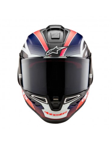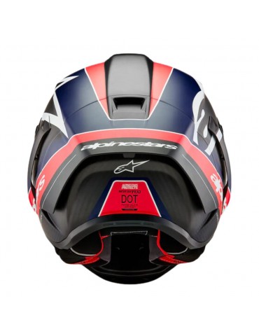 Capacete ALPINESTARS Supertech R10 Team ECE06/DOT/FIM preto / vermelho carbono / azul fosco. Como resultado de mais de 10 anos de investigação, desenvolvimento e testes intensivos, o objetivo da família de capacetes Supertech é criar os capacetes mais avançados, protectores e com melhor desempenho possível para pilotos e motociclistas de todo o mundo. Após anos de extensa investigação, desenvolvimento e testes do capacete de corrida de estrada Supertech R10 pelo Departamento de Desenvolvimento de Produtos de Capacete da Alpinestars, juntamente com a lenda do MotoGP Andrea Dovizioso e os pilotos de MotoGP Jorge Martin e Jack Miller. Com o S-R10, o objetivo do design era assegurar o mais elevado nível de desempenho, especialmente em termos de proteção e de um novo nível de segurança.