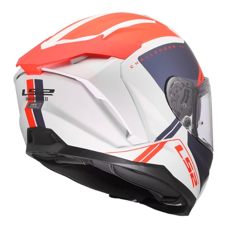 Capacete LS2 FF817 Challenger II Titan branco fosco / azul / vermelho. Um capacete de turismo de alto desempenho concebido para viagens longas. Fabricado com o nosso HPFC, que combina leveza e segurança excecionais. Equipado com uma excelente visão periférica e uma viseira solar integrada. Equipado com Pinlock 120 XLT Max Vision para maior segurança.