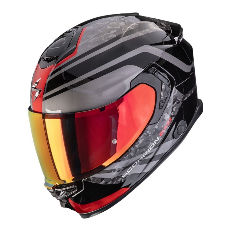 Capacete SCORPION EXO-GT SP Air Arten preto / vermelho. O Scorpion EXO-GT SP Air Arten representa a nova geração de capacetes touring premium, concebido para quem procura máxima segurança, silêncio e conforto em viagens longas. A sua calota em carbono 3K Twill e Chopped oferece uma absorção de impactos superior com grande leveza, enquanto a viseira e o visor solar asféricos de Classe Ótica 1 garantem uma visão nítida e sem distorções.