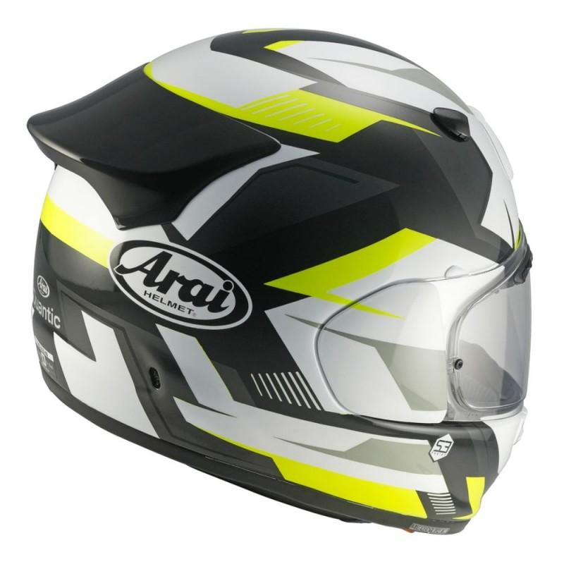 Capacete ARAI Quantic Supra amarelo. Apresentamos o novo capacete de motocicleta ARAI, em conformidade com a norma ECE R22-06. Seu casco externo, fabricado artesanalmente, adapta-se perfeitamente ao formato da cabeça. Sua superfície lisa proporciona melhor deslizamento. Em caso de queda, o spoiler se desprende sem comprometer a segurança. O casco interno é composto por cinco densidades diferentes de poliestireno expandido (EPS), garantindo absorção de energia otimizada graças à combinação de um casco externo rígido e um casco interno flexível.