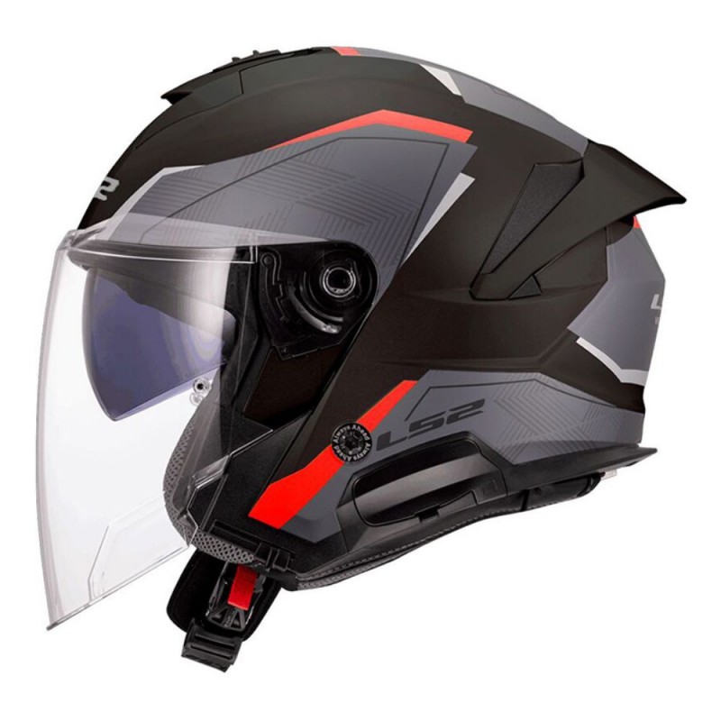 Capacete LS2 OF618 Verso II AIR preto / vermelho. Capacete jet feito de liga de polímero (KPA) que oferece altos níveis de proteção. Possui uma grande tela transparente, uma viseira solar integrada e um sistema de ventilação eficiente. Uma opção muito boa de capacete para uso diário na cidade.